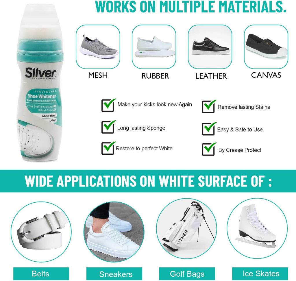 Restores whiteness to all shoe types (Leather, Vinyl, Nylon, Canvas etc)